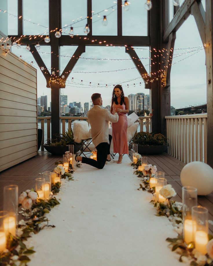 Instead of overflowing the setting with red roses and anything pink, you see that brown-beige color in the background that makes the environment feel natural. & Whith the white carpet that leads to the couple standing at the other end of the space & the chairs that rest behind them, you get a feeling of how delicate that moment is. At the same time, there's that orangish-yellow color illuminating from the candles that provides a nice little accent to the scene.