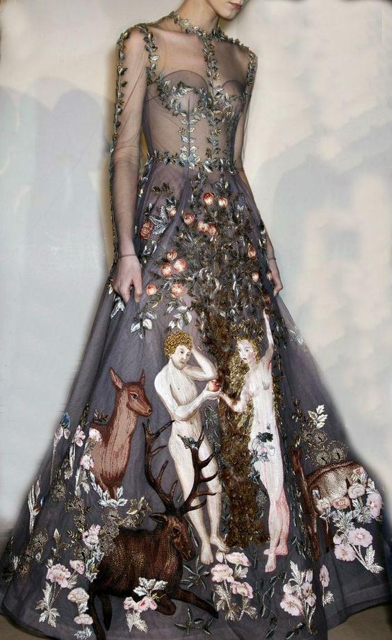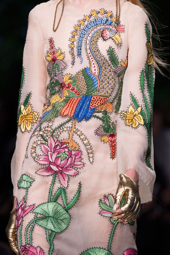 Jacobean embroidery is a style of embroidery design, rather than an embroidery technique. It refers to a kind of mood board wherein highly stylized mythical creatures, plants, and maidens reign supreme. The name “Jacobean” comes from James I of England, under whose reign this style of décor became popular. This decor was not accessible to all, “in trying to think of a contemporary form that is comparably labor intensive, animation came to mind,” explained specialist Susan Brown in a 2012 interview with Cooper Hewitt. Because of the craftsmanship required to produce such work, Jacobean still remains primarily within the upper class. Today, it is undeniable that designers like Gucci’s Alessandro Michele and Dior’s Maria Grazia Chiuri are inspired by Jacobean embroidery.